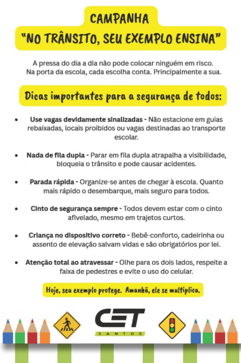 A Companhia de Engenharia de Tráfego (CET-Santos) inicia nesta segunda-feira (2) ampla campanha nas portas das escolas, com o objetivo de organizar o trânsito e reforçar a segurança de estudantes, pedestres e motoristas.