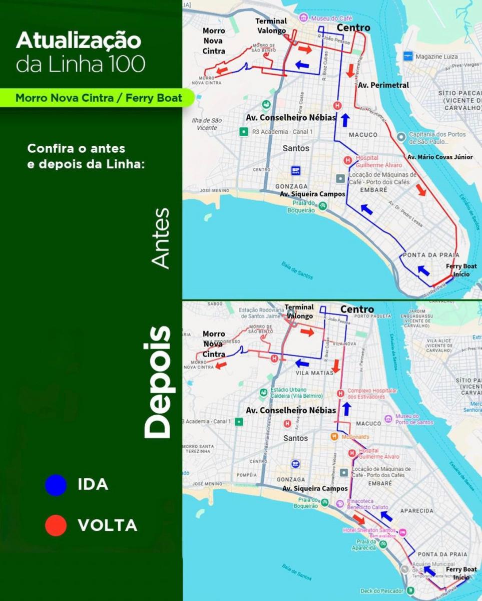 A linha 100 do transporte coletivo municipal de Santos, que liga o Morro da Nova Cintra à Ponta da Praia (ferry boat), passará a operar com novo itinerário no sentido de volta (desde o Centro/Valongo), a partir de 1º de maio. A mudança, que ainda tem caráter experimental, prevê a circulação pela Avenida Conselheiro Nébias, a mesma utilizada no sentido de ida.